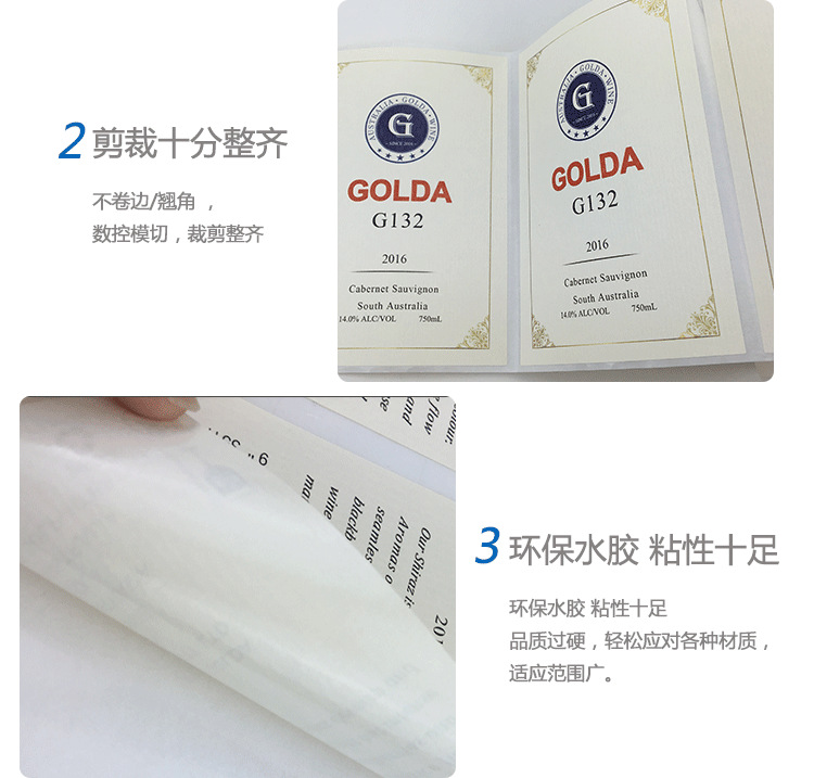 产品名称:酒类不干胶标签纸 颜色:单色、四色、专色 使用胶型:油胶、水胶、热熔胶 规格:根据客户自己定制 形状:圆形、长方形、椭圆形、自定义形状等 使用底纸:黄色离型纸,白色离型纸,白色格拉辛等 材质:镜面不干胶,PVC不干胶,易碎纸,铜板不干胶,牛皮纸等