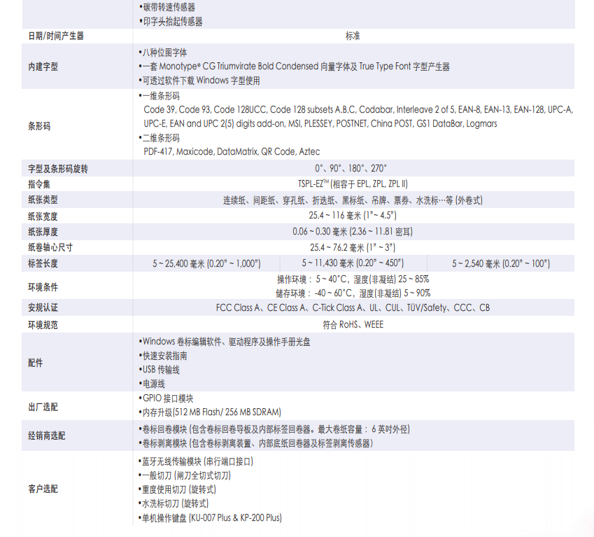 完整的选购配件:标签剥离模组、6英吋外径标签回卷模组、GPIO介面模组、蓝牙无线传输模组、802.11 b/g/n 无线网路模组、多款切刀选择