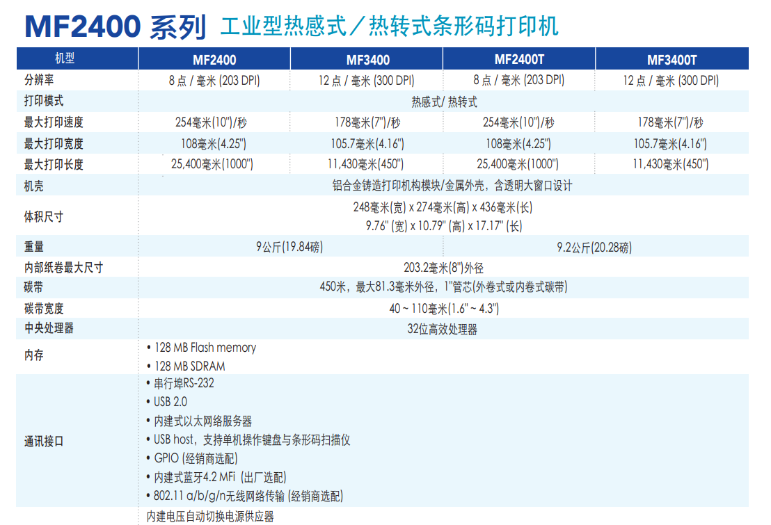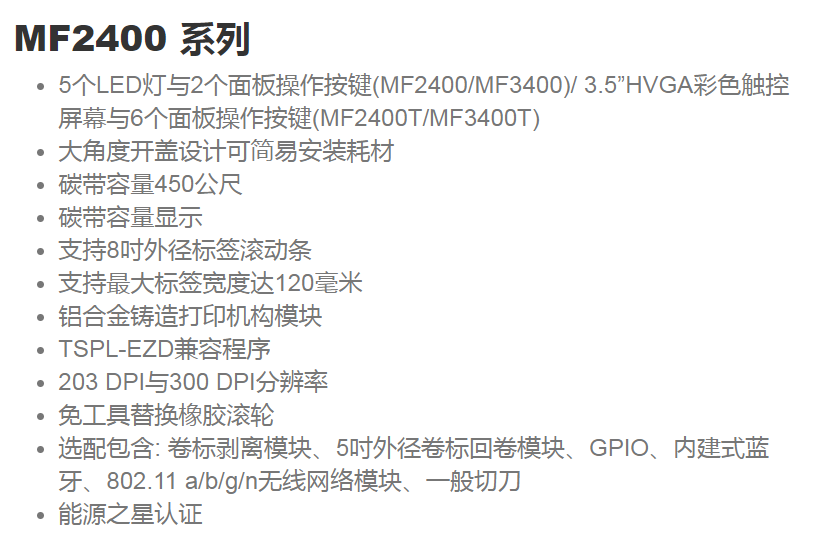 5个LED灯与2个面板操作按键(MF2400/MF3400)/ 3.5”HVGA彩色触控屏幕与6个面板操作按键(MF2400T/MF3400T)