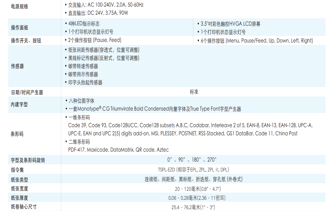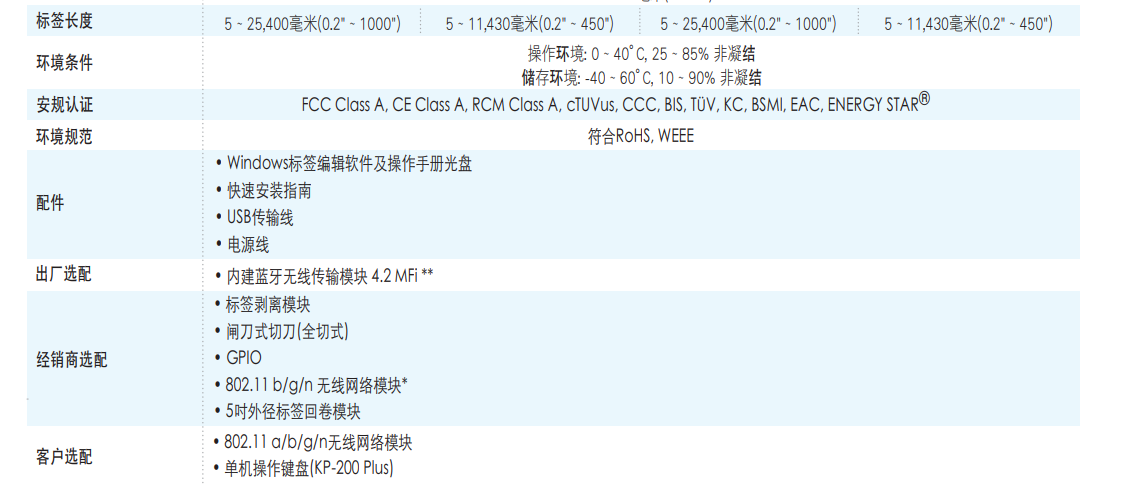 选配包含: 卷标剥离???、5吋外径卷标回卷模块、GPIO、内建式蓝牙、802.11 a/b/g/n无线网络???、一般切刀