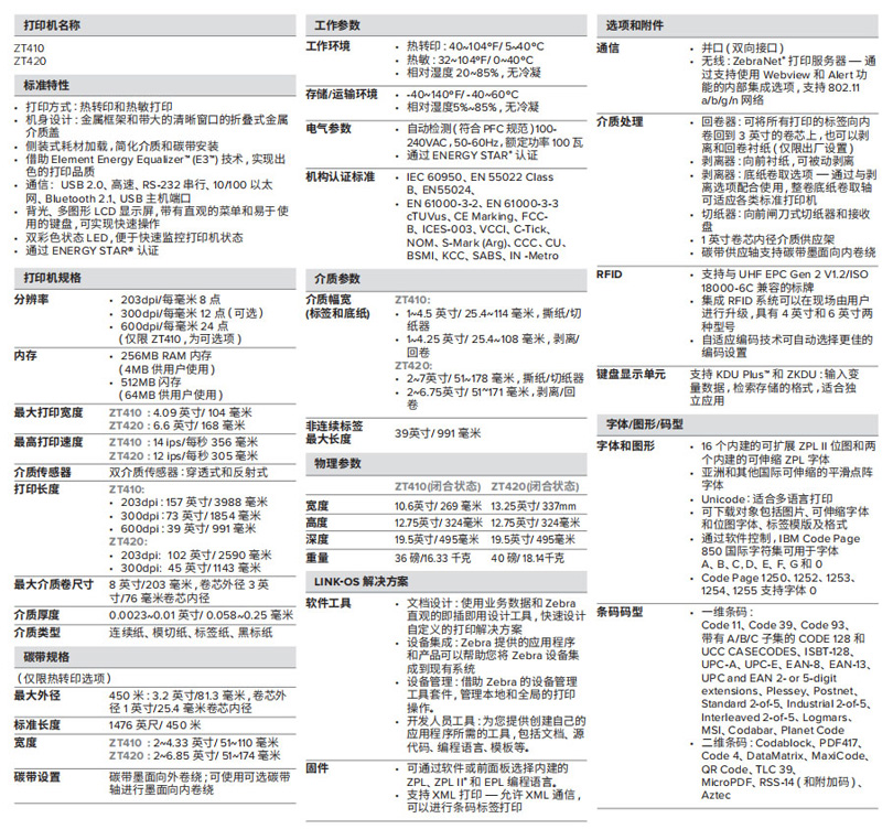zT400系列基于Z系列经现场实践验证的可靠性构建而成,而且在打印速度、打印质量和连接选项方面有所增强。ZT400系列打印机具有出色的易用性,它拥有直观的基于图标的LCD图形用户界面,并且易于安装耗材。此外,ZT400系列的打印机还包括标准USB、串行、以太网和 Bluetooth°功能。扩展的RFD功能提供了更强的追踪能力、更深入的可见性和企业洞察力。