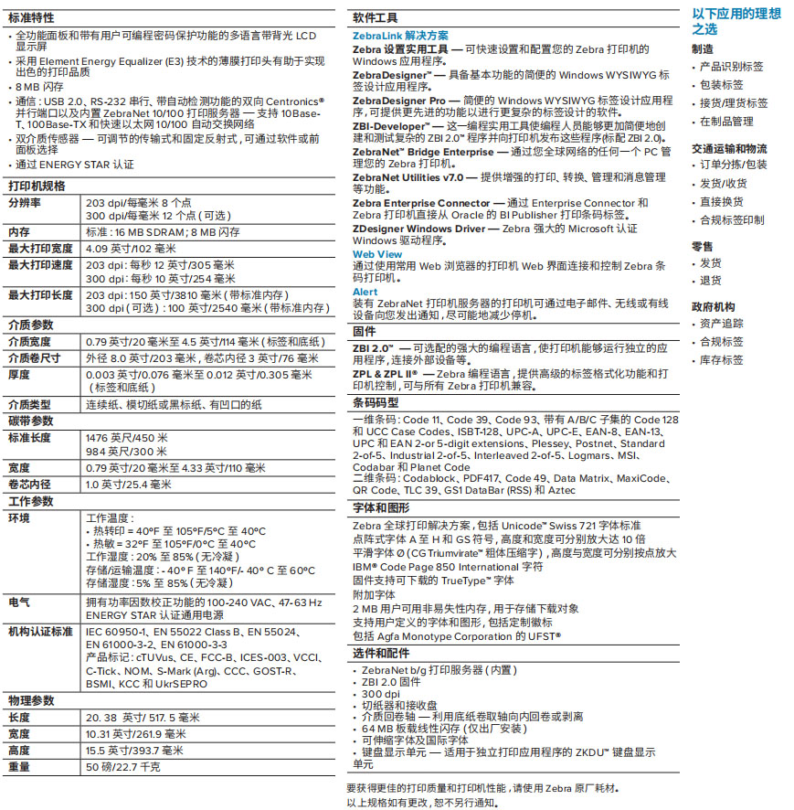 105SLPlus充分利用Zebra经实践验证的电子平台,可满足大批量应用的需要——包括大容量存储以存储格式、字体和图形。Element Energy Equalizer? (E3?) 技术能够延长打印头的寿命并提供出色的打印品质。105SLPlus采用全金属结构,具备Zebra享有盛誉的出色耐用性,可承受制造和仓储环境中常见的碰撞。这款打印机专为全天候使用而设计,